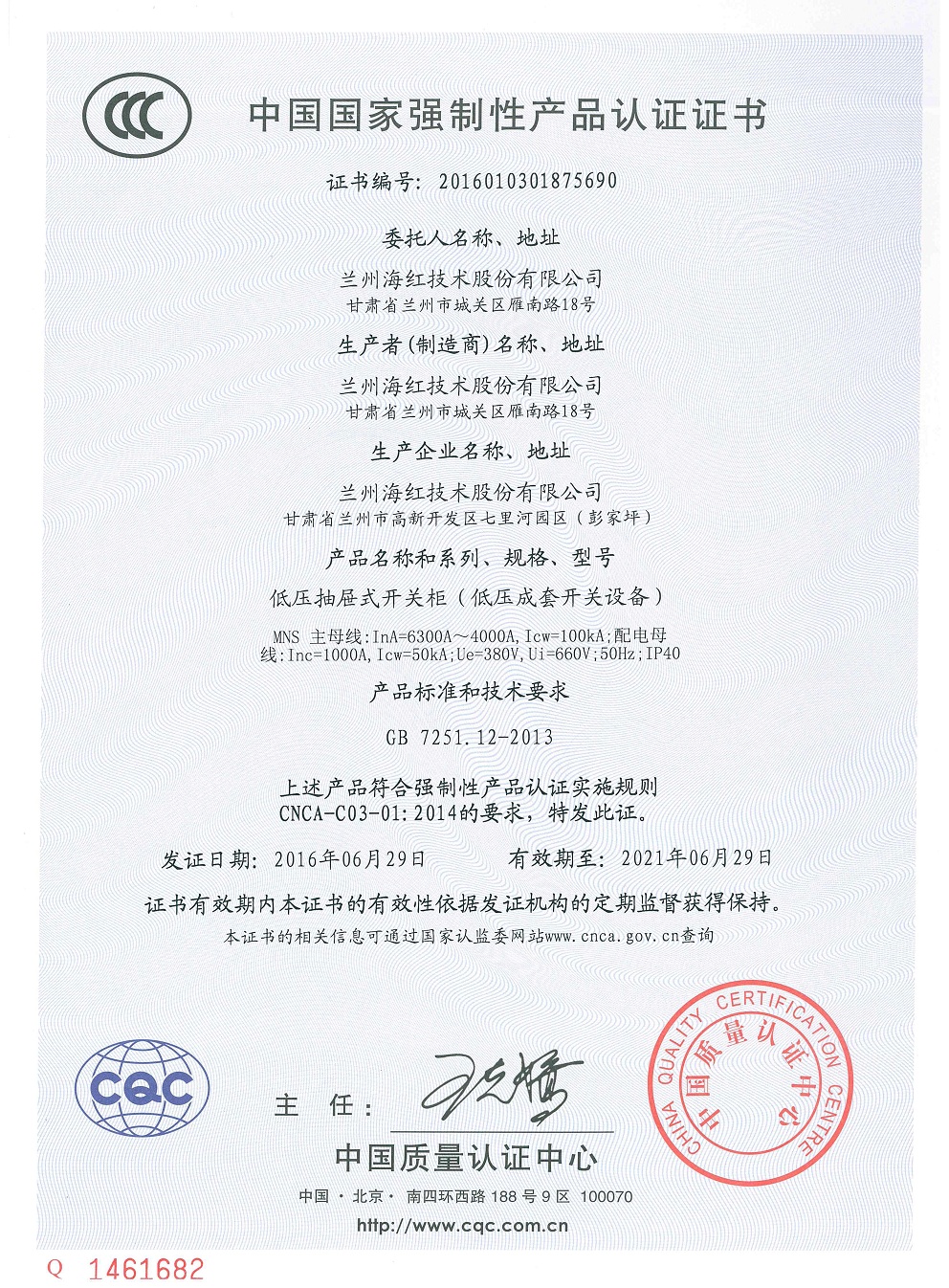 我公司的“低壓抽屜式開關(guān)柜(低壓成套開關(guān)設(shè)備)MNS(6300A-4000A)”通過(guò)國(guó)家CCC產(chǎn)品認(rèn)證并取得證書