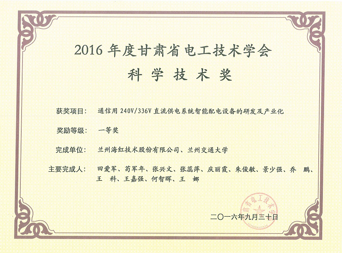 我公司“通信用240V/336V直流供電系統(tǒng)智能配電設(shè)備的研發(fā)及產(chǎn)業(yè)化”項(xiàng)目榮獲2016年度甘肅省電工技術(shù)學(xué)會(huì)科學(xué)技術(shù)獎(jiǎng)一等獎(jiǎng)