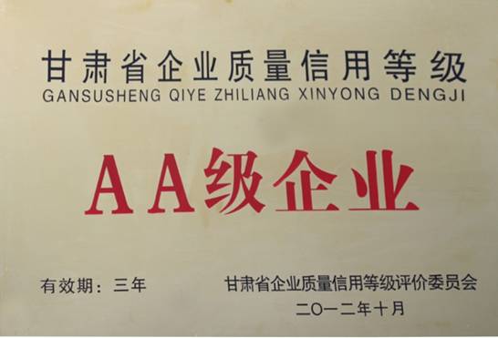 公司被評為2012年度甘肅省企業(yè)質(zhì)量信用等級AA級企業(yè)