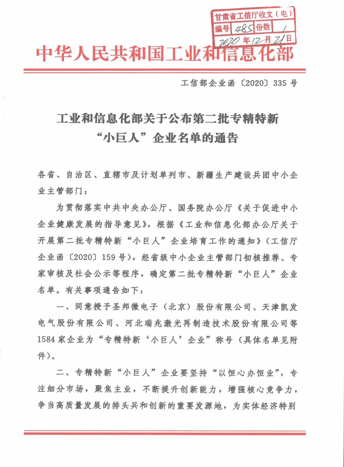根據(jù)中華人民共和國工業(yè)和信息化部印發(fā)《工業(yè)和信息化部關(guān)于公布第二批專精特新“小巨人”企業(yè)名單的通告》(工信部企業(yè)函〔2020〕335號)文件,我司被工業(yè)和信息化部授予“專精特新&l...