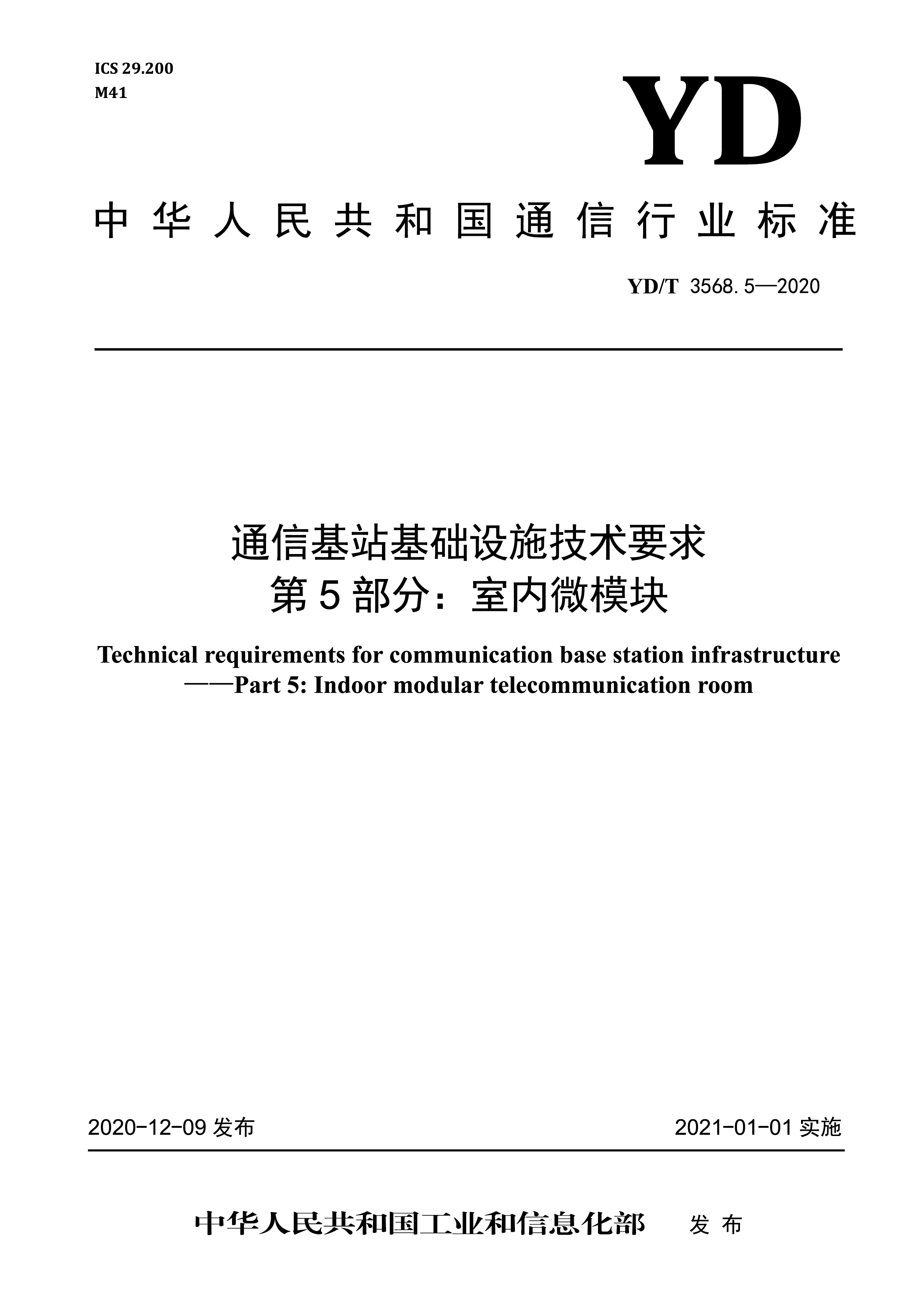 我司參與起草的行業(yè)標(biāo)準(zhǔn)《通信基站基礎(chǔ)設(shè)施技術(shù)要求 第5部分:室內(nèi)微模塊》(YD/T 3568.5-2020)經(jīng)中華人民共和國工業(yè)和信息化部批準(zhǔn)發(fā)布,已于2021年01月01日實施。...