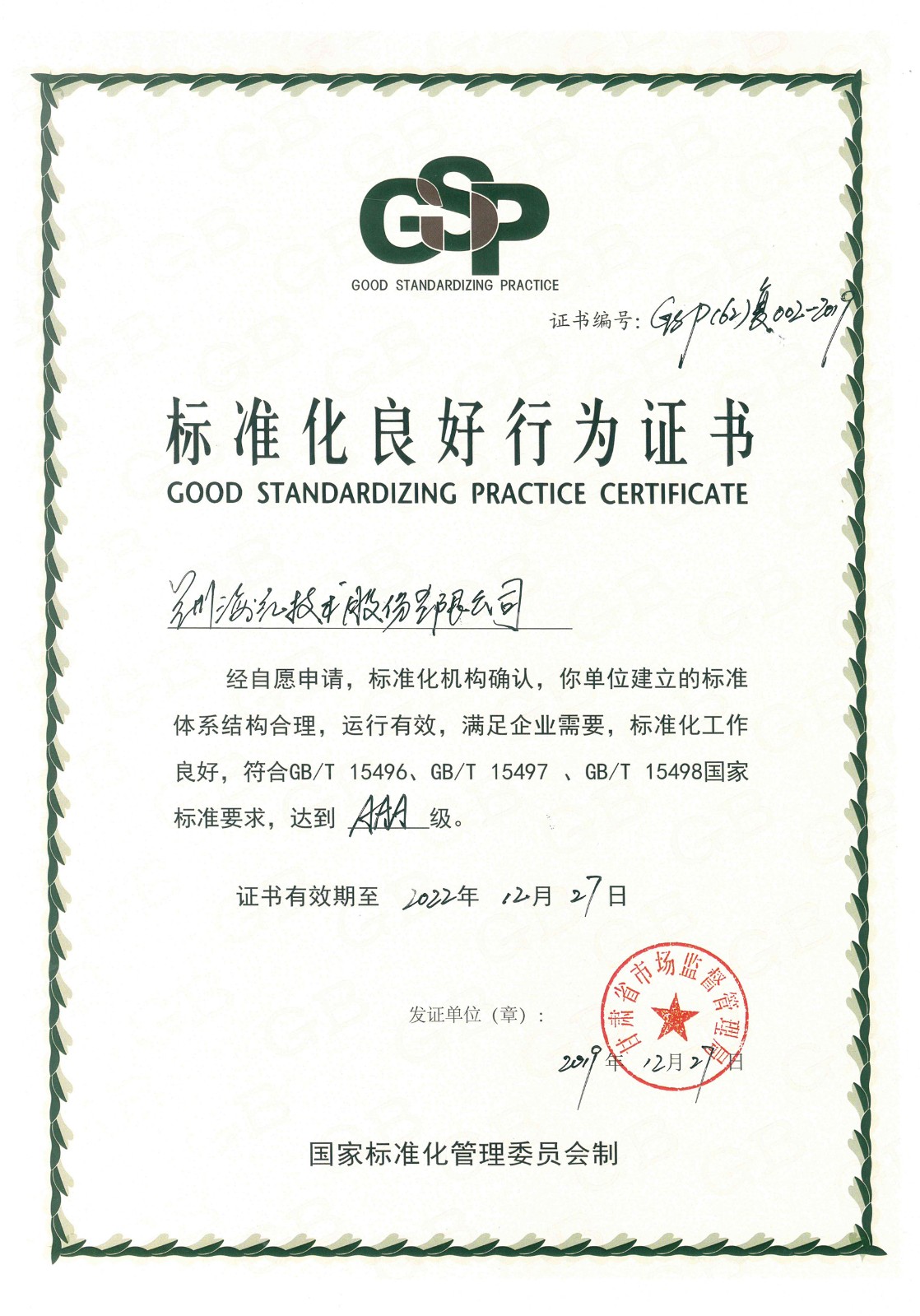 我司再次被省市場監(jiān)督管理局認定為“AAA級標準化良好行為企業(yè)”