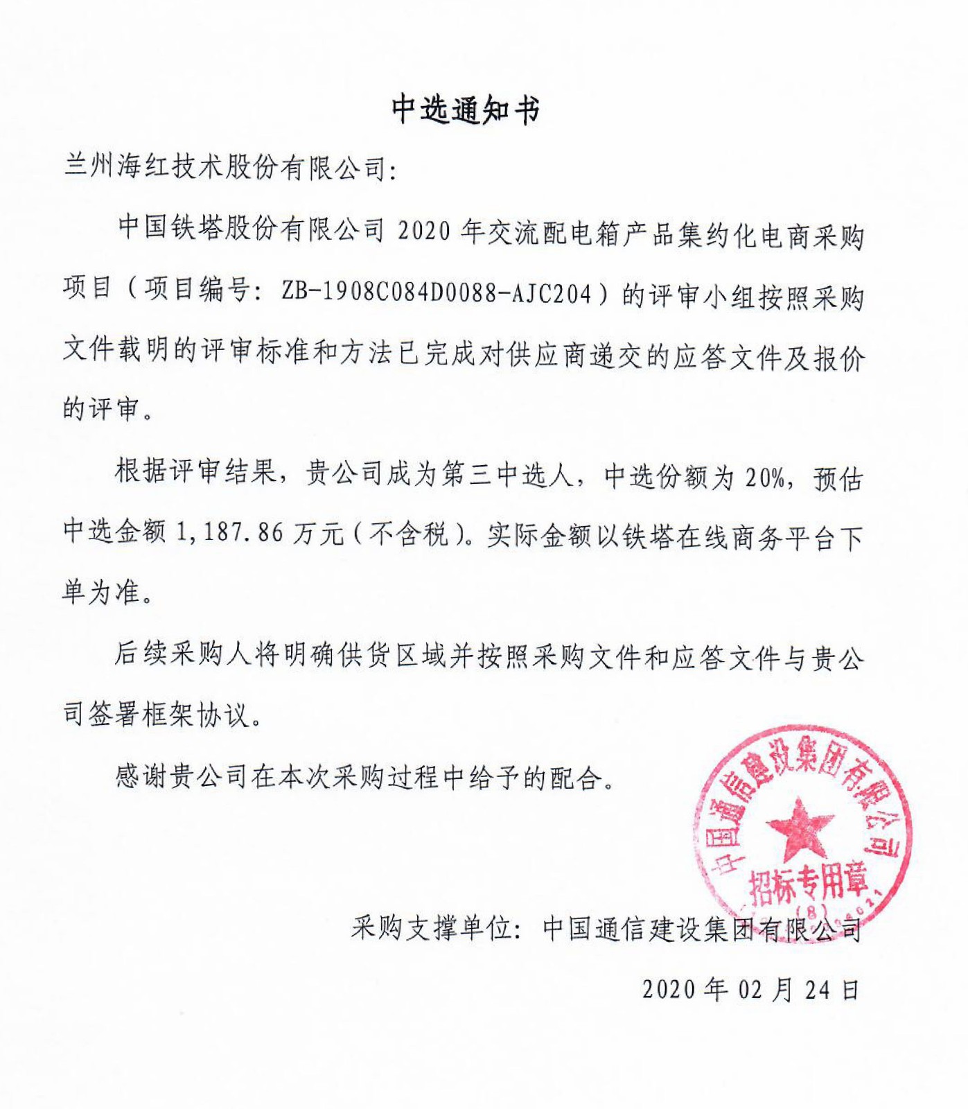 我司成功中標“中國電信2019年綜合集裝架產(chǎn)品集中采購”項目,將對我司2020年經(jīng)營業(yè)績、市場拓展產(chǎn)生積極的影響。