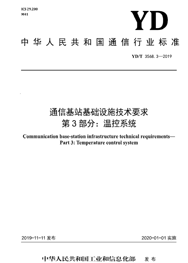 我司參與起草的《通信基站基礎(chǔ)設(shè)施技術(shù)要求 第3部分:溫控系統(tǒng)》(YD/T 3568.3-2019)行業(yè)標準經(jīng)中華人民共和國工業(yè)和信息化部批準發(fā)布,已于2020年01月01日實施。該...