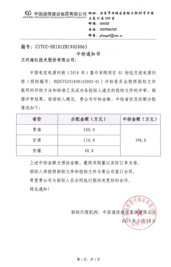我公司參與投標(biāo)的“中國電信交/直流電源列柜集中采購項(xiàng)目”成功中標(biāo)。此次中標(biāo)是對我公司技術(shù)、工藝、質(zhì)量、服務(wù)等綜合競爭力的再次肯定,將進(jìn)一步擴(kuò)大我司的品牌影響力,對2019年度經(jīng)營指...