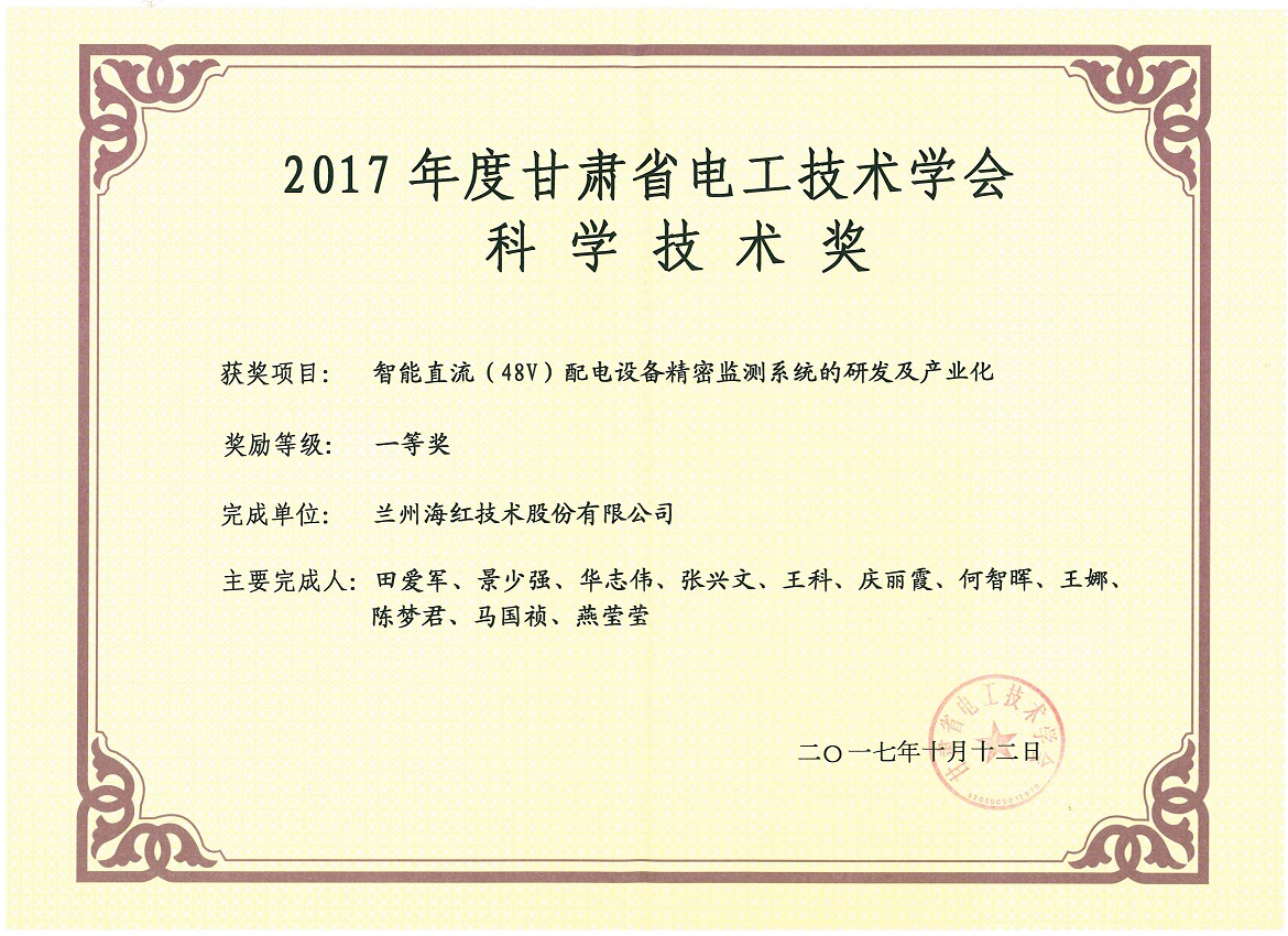 我公司“智能直流(48V)配電設(shè)備精密監(jiān)測系統(tǒng)的研發(fā)及產(chǎn)業(yè)化”項目榮獲2017年度甘肅省電工技術(shù)學(xué)會科學(xué)技術(shù)一等獎