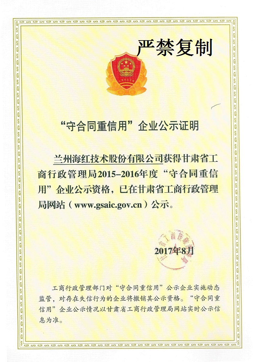 我公司及子公司(海源科技)分別榮獲2016年度甘肅省、蘭州市、蘭州高新區(qū)“守合同、 重信用”企業(yè)榮譽稱號