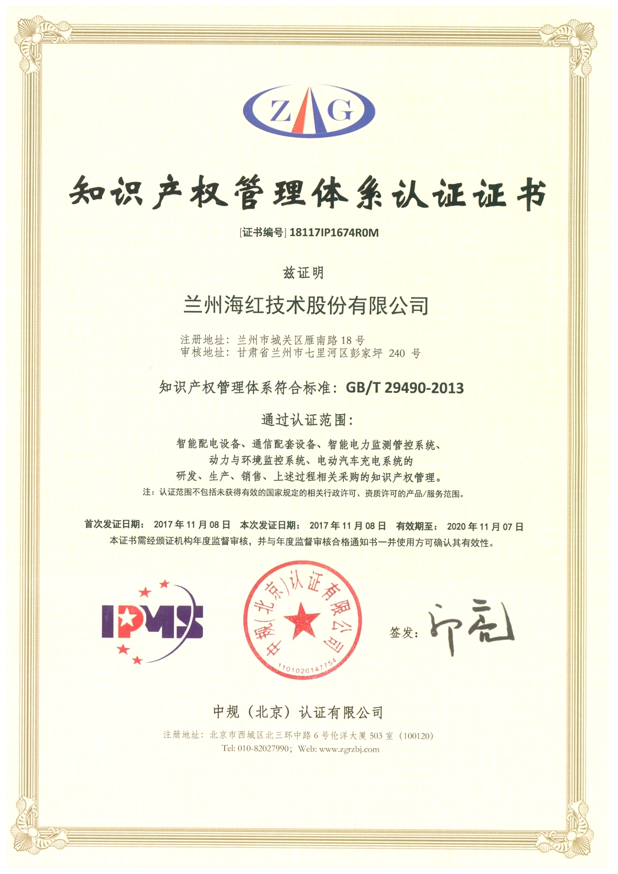 2017年10月20日至21日,我司以完整規(guī)范的知識產(chǎn)權(quán)管理體系順利通過了中規(guī)(北京)認證有限公司審核組現(xiàn)場評估審核,并于11月8日取得認證證書。同時,我司也成為甘肅省第二家通過“...