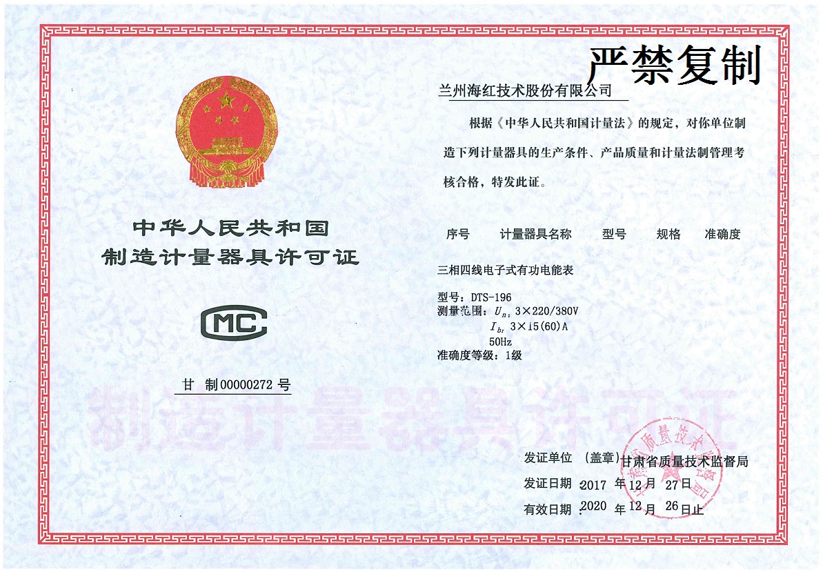 我公司生產(chǎn)制造的“三相四線電子式有功電能表”產(chǎn)品,經(jīng)甘肅省質(zhì)量技術(shù)監(jiān)督局的現(xiàn)場審核,生產(chǎn)條件、產(chǎn)品質(zhì)量和計量法制管理考核合格,通過CMC認證,取得制造計量器具許可證。