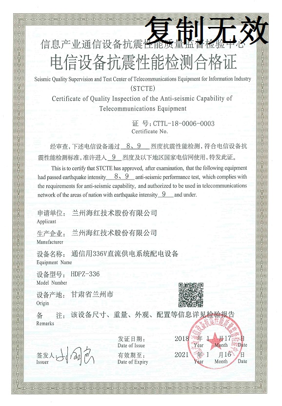 我公司“通信用336V直流供電系統(tǒng)配電設(shè)備”產(chǎn)品取得電信設(shè)備抗震性能檢測合格證