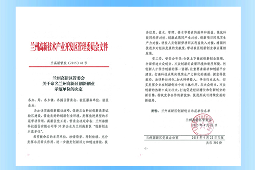 我公司被蘭州高新區(qū)管委會命名為“創(chuàng)新創(chuàng)業(yè)示范單位”。