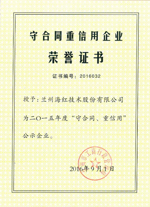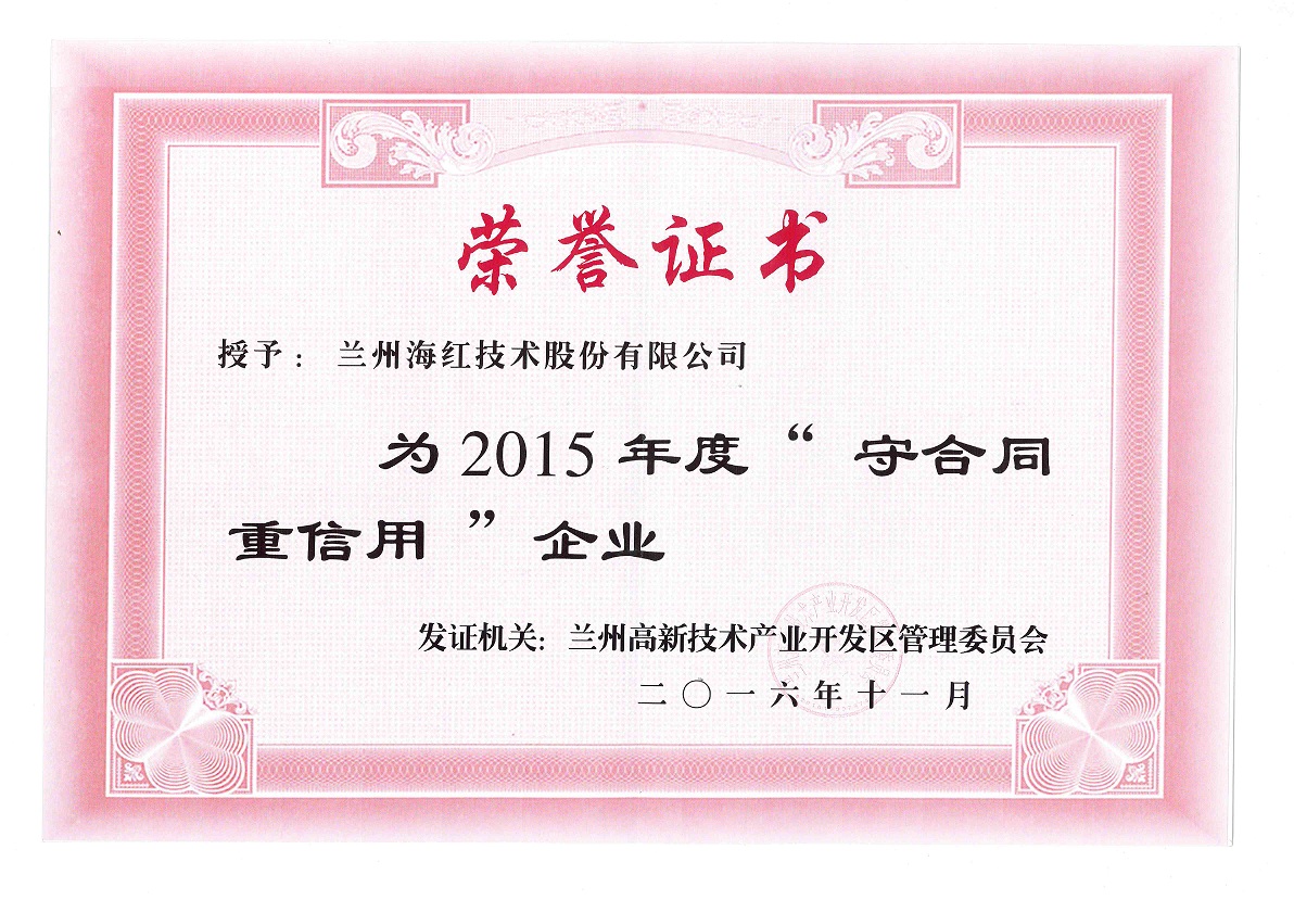 我公司榮獲2015年度“守合同、 重信用”企業(yè)榮譽稱號 By 海紅技術 2016-12-23 00:00:00 0次 上一篇:我公司“通信用240V/336V直流供電系統(tǒng)智能配電設備的研發(fā)及產業(yè)化”項目榮獲2016年度甘肅省電工技術學會科學技術獎一等獎 下一篇:我公司“電動汽車充電樁”產品榮獲甘肅省第二屆“創(chuàng)新杯”工業(yè)設計大賽(產品組)銅獎
