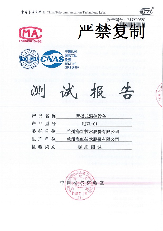 我公司的“背板式溫控設(shè)備(HJZL-01)”產(chǎn)品取得中國(guó)泰爾實(shí)驗(yàn)室的委托測(cè)試測(cè)試報(bào)告。至此,我公司共取得32個(gè)產(chǎn)品的試驗(yàn)檢驗(yàn)報(bào)告。