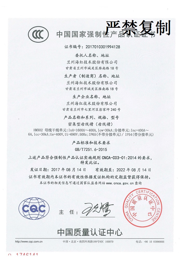 我公司的“密集型母線槽 (HMX01型)與密集型母線槽 (HMX02型)”產(chǎn)品通過(guò)中國(guó)質(zhì)量認(rèn)證中心的CCC認(rèn)證并取得證書。至此,我公司共取得14個(gè)產(chǎn)品的CCC認(rèn)證證書。