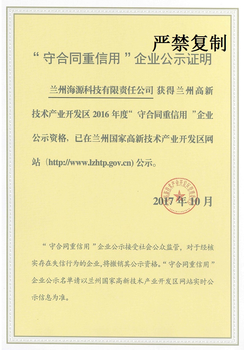 我公司及子公司(海源科技)被蘭州市高新技術(shù)產(chǎn)業(yè)開發(fā)區(qū)管理委員會(huì)評(píng)定為2016年度“守合同、重信用”企業(yè)。同時(shí)我公司被甘肅省工商行政管理局評(píng)定為2016年度“守合同、重信用”企業(yè),子公司(海源科技)被蘭州市工商行政管理局評(píng)定為2016年度“守合同、重信用”企業(yè)。