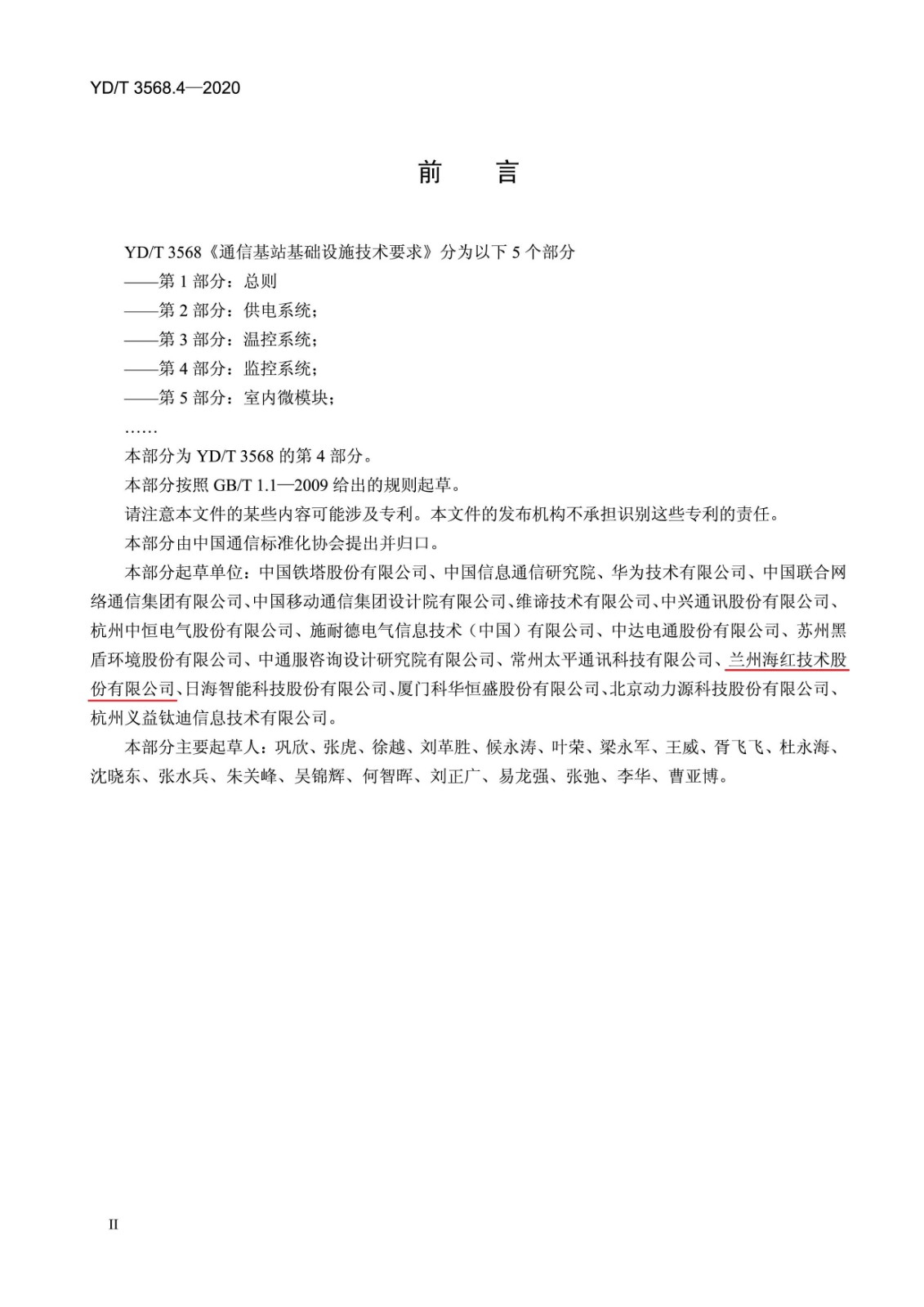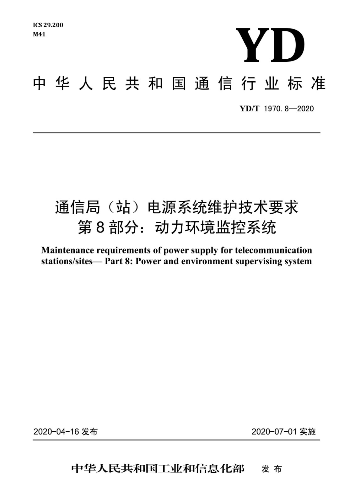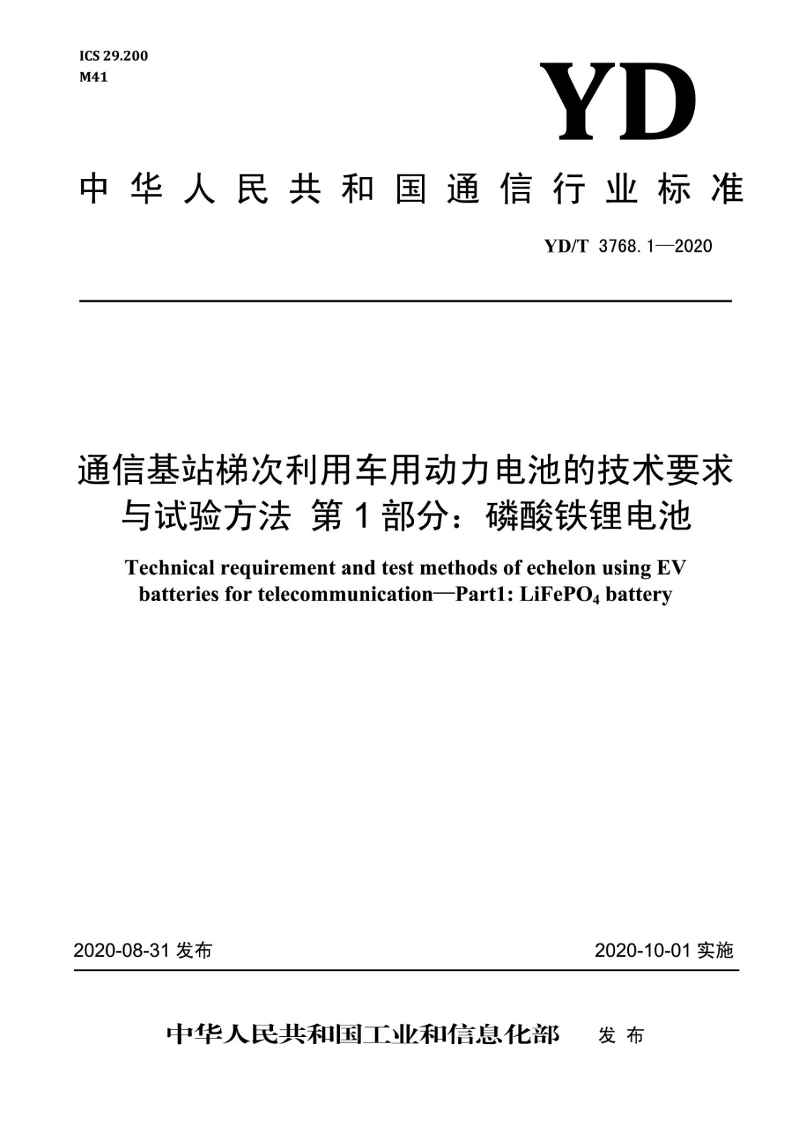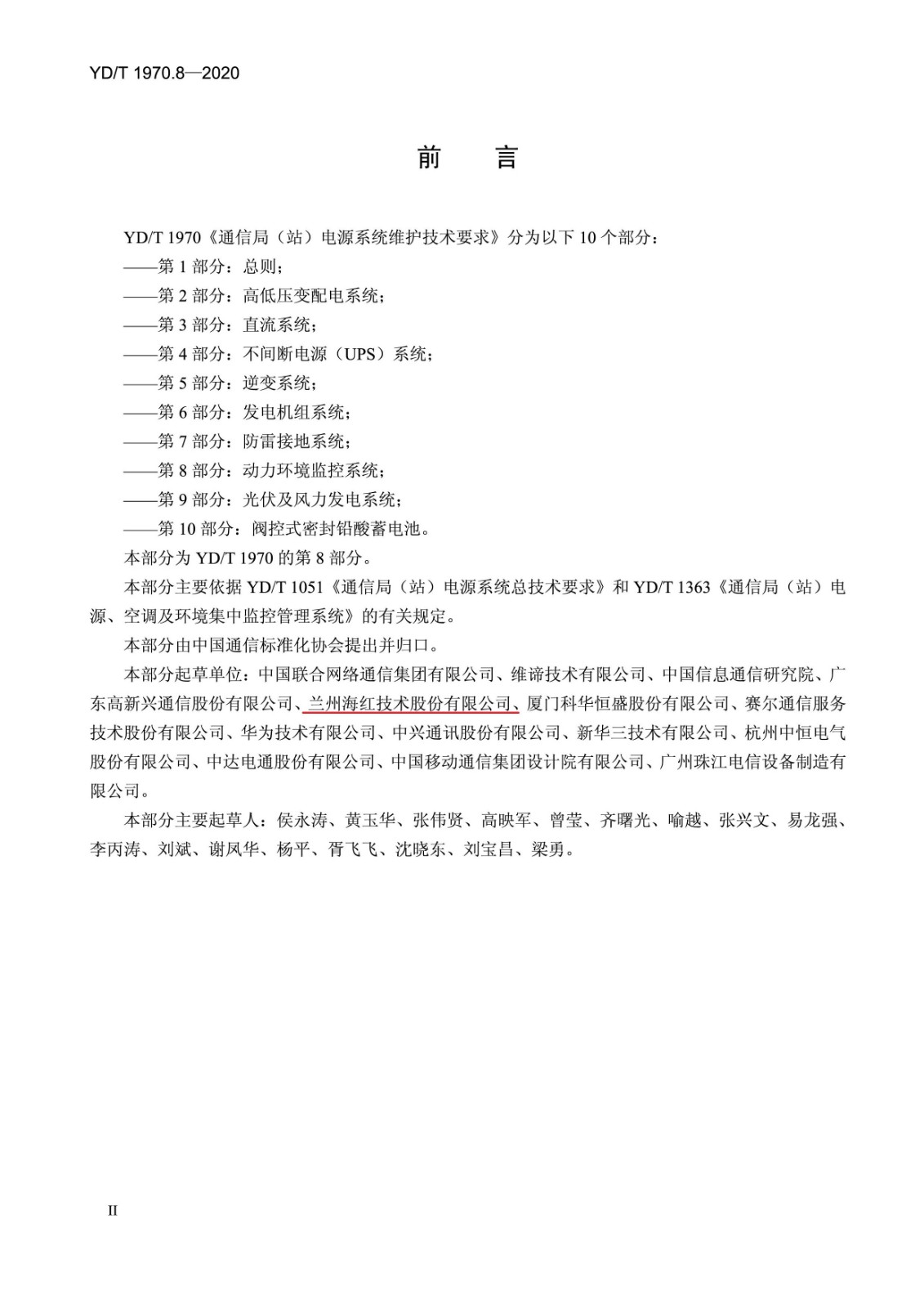 我司參與起草的《通信局(站)電源系統(tǒng)維護(hù)技術(shù)要求 第 8 部分:動力環(huán)境監(jiān)控系統(tǒng)》(YD/T 1970.8-2020)、《通信基站基礎(chǔ)設(shè)施技術(shù)要求第 4 部分:監(jiān)控系統(tǒng)》(YD/T 3568.4-2020)、《通信基站梯次利用車用動力電池的技術(shù)要求與試驗方法第 1 部分:磷酸鐵鋰電池》(YD/T 3768.1-2020)、《數(shù)據(jù)中心用市電加保障電源的兩路供電系統(tǒng)技術(shù)要求》(YDT3767-2020)四項行業(yè)標(biāo)準(zhǔn)經(jīng)中華人民共和國工業(yè)和信息化部批準(zhǔn)發(fā)布,前兩項已于2020年07月01日實施,后兩項已于2020年10月01日實施。以上標(biāo)準(zhǔn)是繼《通信電源和機(jī)房環(huán)境節(jié)能技術(shù)指南第5部分:氣流組織》、《網(wǎng)絡(luò)機(jī)柜用分布式電源系統(tǒng)》、《通信電源和機(jī)房環(huán)境節(jié)能技術(shù)指南 第2部分:應(yīng)用條件》、《通信用240V直流供電系統(tǒng)使用技術(shù)要求》、《通信局(站)電源系統(tǒng)總技術(shù)要求》、《通信用240V/336V直流配電單元》、《通信機(jī)房用光纖槽道》、《通信基站基礎(chǔ)設(shè)施技術(shù)要求 第3部分:溫控系統(tǒng)》、《通信基站基礎(chǔ)設(shè)施技術(shù)要求 第1部分:總則》、《通信基站基礎(chǔ)設(shè)施技術(shù)要求 第2部分:供電系統(tǒng)》十項標(biāo)準(zhǔn)之后,由我司參與起草正式出版的第11項、第12項、第13項、第14項行業(yè)標(biāo)準(zhǔn)。