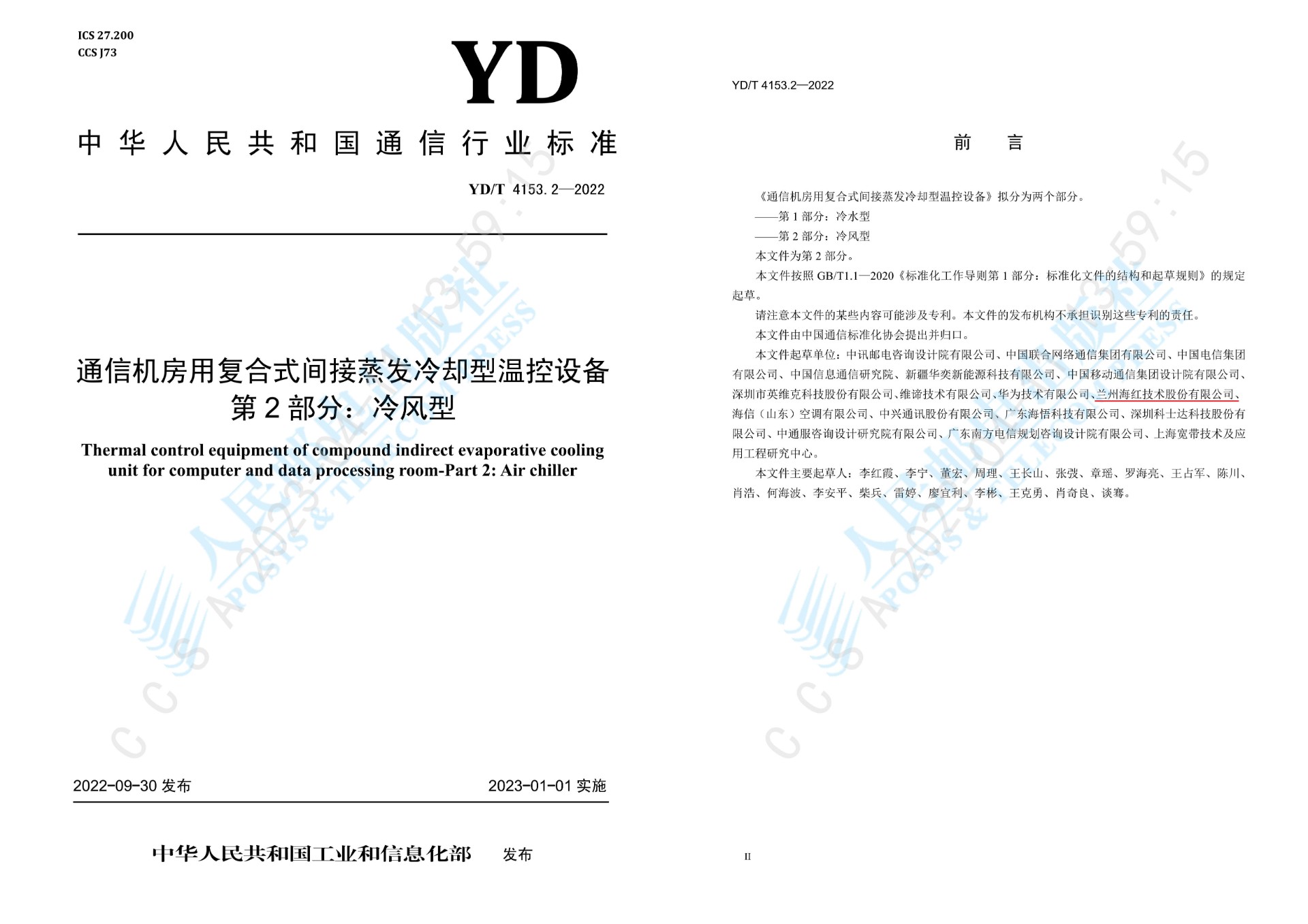 我司參與起草的兩項行業(yè)標(biāo)準(zhǔn)《通信機房用復(fù)合式間接蒸發(fā)冷卻型溫控設(shè)備 第1部分:冷水型》(YD/T 4153.1-2022)及《通信機房用復(fù)合式間接蒸發(fā)冷卻型溫控設(shè)備 第2部分:冷風(fēng)型》(YD/T 4153.1-2022)經(jīng)中華人民共和國工業(yè)和信息化部批準(zhǔn)發(fā)布,已于2023年01月01日實施。同時,我司參與的兩項研究課題也于近日出版了研究報告,分別為《雙路直流供配電系統(tǒng)應(yīng)用研究》及《移動通信基站設(shè)備應(yīng)用環(huán)境條件研究》。 至此我司共參與起草、修訂行業(yè)標(biāo)準(zhǔn)19項、研究課題2項,詳細情況如下: