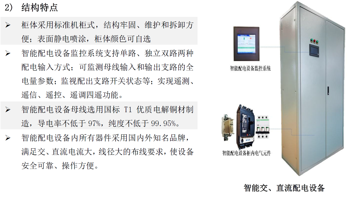 1)通信用智能交、直流配電設(shè)備由柜體、智能監(jiān)控系統(tǒng)、主要元器件、母線等組成。